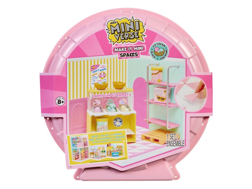 S Mini Místnostmi můžeš vytvořit vlastní svět pro Miniverse miniatury! Tento set ti umožní nejen vystavit své sběratelské kousky, ale i postavit si vlastní tematickou místnost podle své fantazie. Balení obsahuje podlahu, stěny, obklady i tapety. Stačí položit dlaždice, připevnit stěny a panely a rozmístit police podle vlastních představ. Zmrzlinový stánek zase pro zmrzlinárnu.