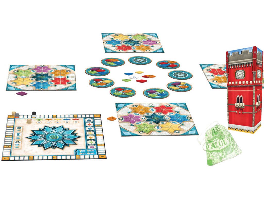 Obsah balení: 132 barevných dílků mozaiky, 4 desky hráčů, deska počítadel, žeton začínajícího hráče, 9 výloh, plátěný sáček, věž, ukazatel kola, 4 ukazatele skóre, pravidla hry