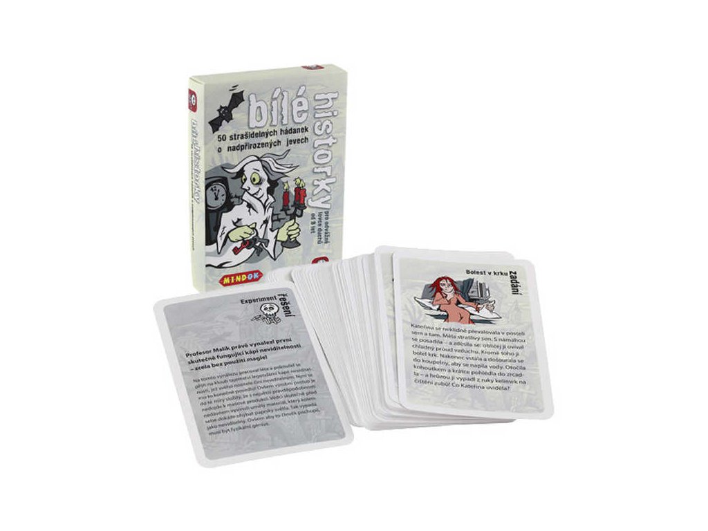 Dětská společenská zábavná desková hra - karty od Mindoka - Bílé Historky - 50 Strašidelných hádanek o nadpřirozených jevech.