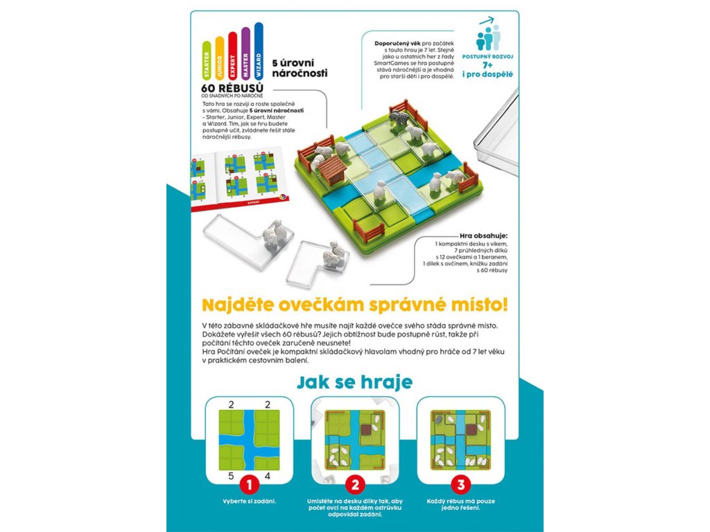 Přiveďte ovečky bezpečně na pastvinu v chytré logické hře Počítání oveček. Na herní desce na vás čekají čtyři ostrůvky různé velikosti, oddělené vodním tokem. Vaším úkolem je umístit na desku všechny dílky s ovcemi tak, abyste splnili zadání konkrétního rébusu. Hra je určena pro 1 hráče a je skvělou zábavou pro děti i dospělé, kteří rádi lámou hlavu.