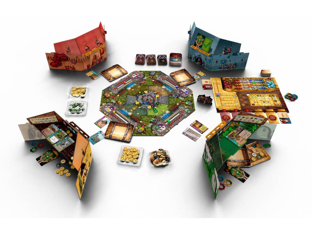 Obsah balení: 4 dvoupatrové zástěny, produkční plán, počítadlo bodů, 95 kartonových žetonů surovin, 54 kartonových dukátů, 8 privilegií v každé barvě, 10 andělských křídel, 10 démonských křídel, 17 žetonů k hádání skrytých rolí, 16 akčních žetonů, 4 truhly na skryté obchodování, 8 dílků duše, 8 odpustků, 80 karet budov, 20 karet událostí, 11 karet inkvizitorů, 4 žetony mistrů v každé varvě, 2 kartonové figurky rozzuřeného davu, 4 plastové ukazatele v každé barvě, pravidla hry