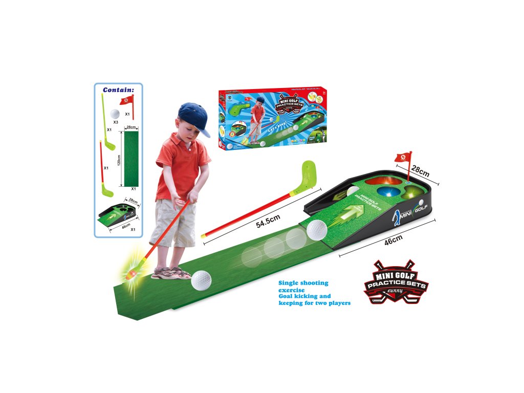 Profesionální golfový zážitek přímo u vás doma!Přinášíme vám kompletní mini golfový set s působivými světelnými a zvukovými efekty! Tento interaktivní herní set promění váš obývák nebo dětský pokoj v skutečné golfové hřiště s veškerým vybavením pro dokonalou hru. Co obsahuje set: Herní základna s efektyGolfová hůl - přizpůsobená velikostGolfový míček - profesionální provedeníPatovací koberec - simuluje greenKompletní příslušenství - vše pro hru Působivé funkce: Světelné efekty - LED indikátory skóreZvukové efekty - realistické zvukyBodovací systém - elektronické počítáníRůzné obtížnosti - nastavitelné překážkyInteraktivní prvky - reagují na úspěšné pokusy Výhody domácího golfu: Celoroční hraní - nezávisle na počasíRozvoj přesnosti - trénink motorikyRodinná zábava - pro všechny věkové kategorieKompaktní velikost - snadné skladováníŽádné green fee - neomezená hra Super tip: Vytvořte si golfový deník a zaznamenávejte své nejlepší výkony. Postupně zvyšujte obtížnost a sledujte svůj pokrok. Hole-in-one čeká na vás!