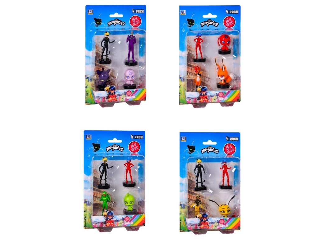 Čtyři kouzelné figurky z pohádky Miraculous: Beruška a černý kocour s razítky. Tyto figurky mají ve spodní části razítka, takže děti si mohou ozdobit školní práce, vytvořit nové obrázky a další. Vhodné pro děti od 3 let.