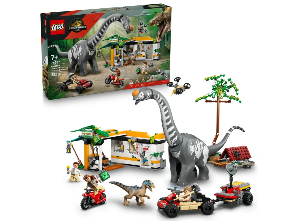 Milovníci filmů od 7 let se se stavebnicí LEGO® Jurassic World (76973) Mise na sledování raptora a titanosaura můžou těšit na napínavé akční honičky. Dárek s dinosaury pro kluky a holky obsahuje tvarované figurky titanosaura a velociraptora a 3 minifigurky: Zoru Bennettovou, Martina Krebse a Dr. Henryho Loomise. Velociraptor má pohyblivou čelist a titanosaurus má pohyblivý krk, hlavu a ocas. Tato interaktivní stavebnice obsahuje nabíjecí stanici, terénní vozidlo s přívěsem, pouzdro na injekční stříkačky se 3 injekcemi, motorku, sestavitelný dron, tábořiště s funkcí padajícího stromu a spoustu dalšího.