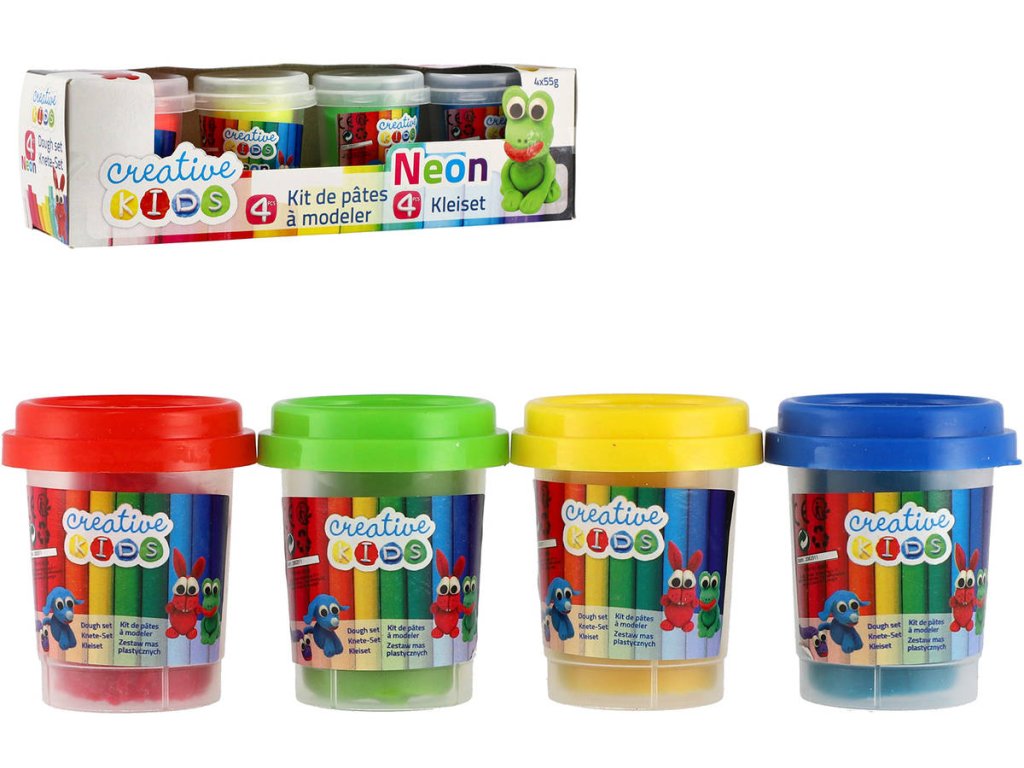 Barevná dětská modelovací hmota ve čtyřech variantách provedení. Balení obsahuje 4 kelímky po 55g v odlišných barvách. (Pastelové barvy, se třpytkami, neonové barvy, klasické barvy).