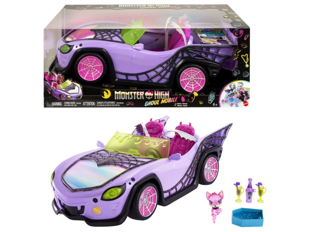 Rozpustilé příšerky z Monster High™ vyráží na divokou jízdu do ulic s naprosto stylovou a démonicky naleštěnou Monstrkárou! Strašidelný tunnig vozidla a bohatá výbava zavazadlového prostoru, jako je například chladící box ve tvaru rakve včetně luxusních skleniček, povyšují tento vůz na hvězdnou limuzínu. Roztomilý mazlíček nezbedných studentek si dokáže náležitě vychutnat divokou jízdu na zadní části kabrioletu! Toto čtyřmístné, monstrózní žihadlo otevírá cestu k mnoha napínavým dobrodružstvím! Panenky nejsou součástí balení. Barvy a provedení se mohou lišit.