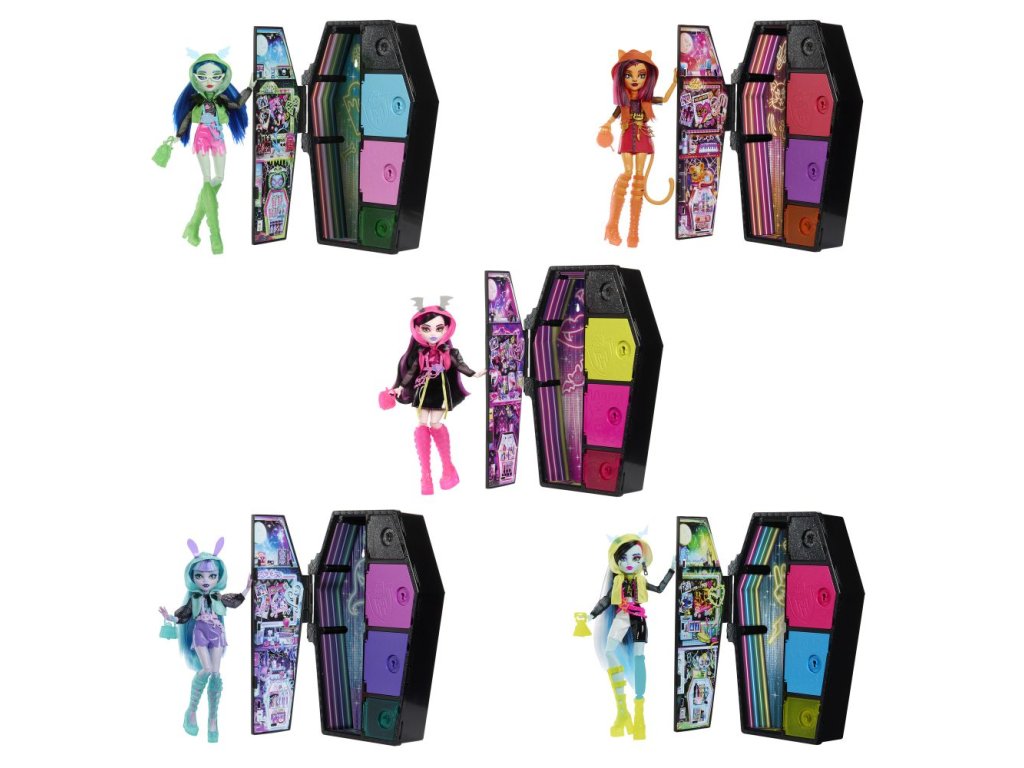 Monster High™ Skulltimate Secrets™ se vrací s edicí Neon - a tentokrát je světélkující! Každý elektrizující set obsahuje panenku Monster High™ s více než 19 překvápky, včetně tří doplňků, které svítí ve tmě. Kouzlo přeměny barvy Color Reveal™, strašidelné rozbalování a skříňka ve tvaru rakve, která je ideální pro vyprávění příběhů a uložení panenky. Každá se prodává samostatně v závislosti na dostupnosti. Panenky jsou zcela kloubové. Panenky nemohou stát samostatně. Barvy a provedení se mohou lišit.