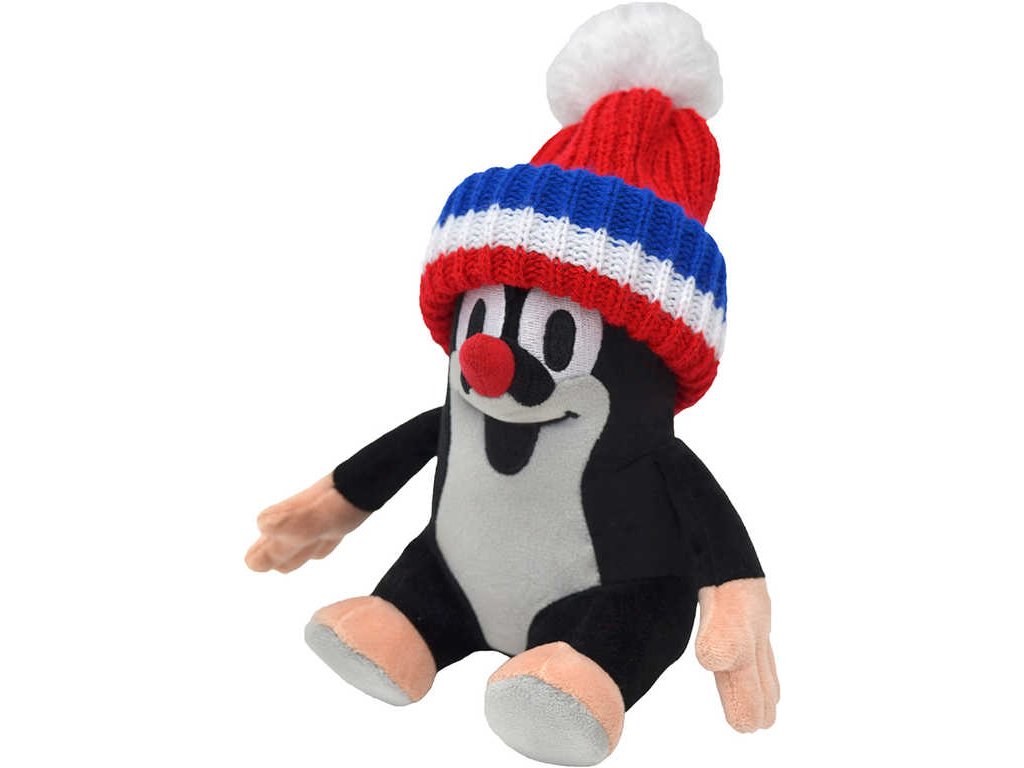Sedící plyšový Krtek se sundávací čepicí (červená trikolora), který po zmáčknutí náhodně přehrává vybrané originální zvuky z pohádek o Krtečkovi. Vyměnitelné baterie jsou součástí. Baleno v dárkové