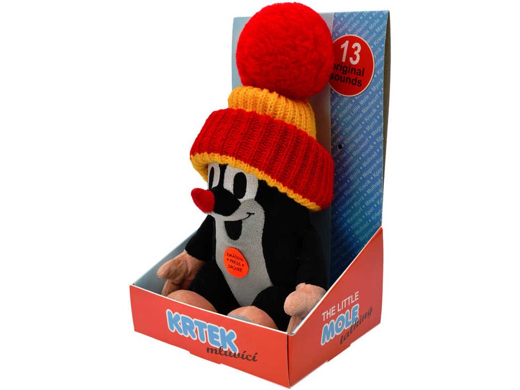 Krteček se sundavací čepicí, který po zmáčknutí náhodně přehrává vybrané originální zvuky z pohádek o Krtečkovi. Baleno v dárkové krabičce. Hračka se zvukem (vydává zvuk, mluví). Červeno-žlutá čepice (žluto-červená)