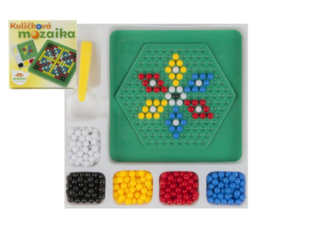 Mozaika obsahuje 250 ks kuliček, pinzetu, oboustrannou destičku a papírové předlohy.