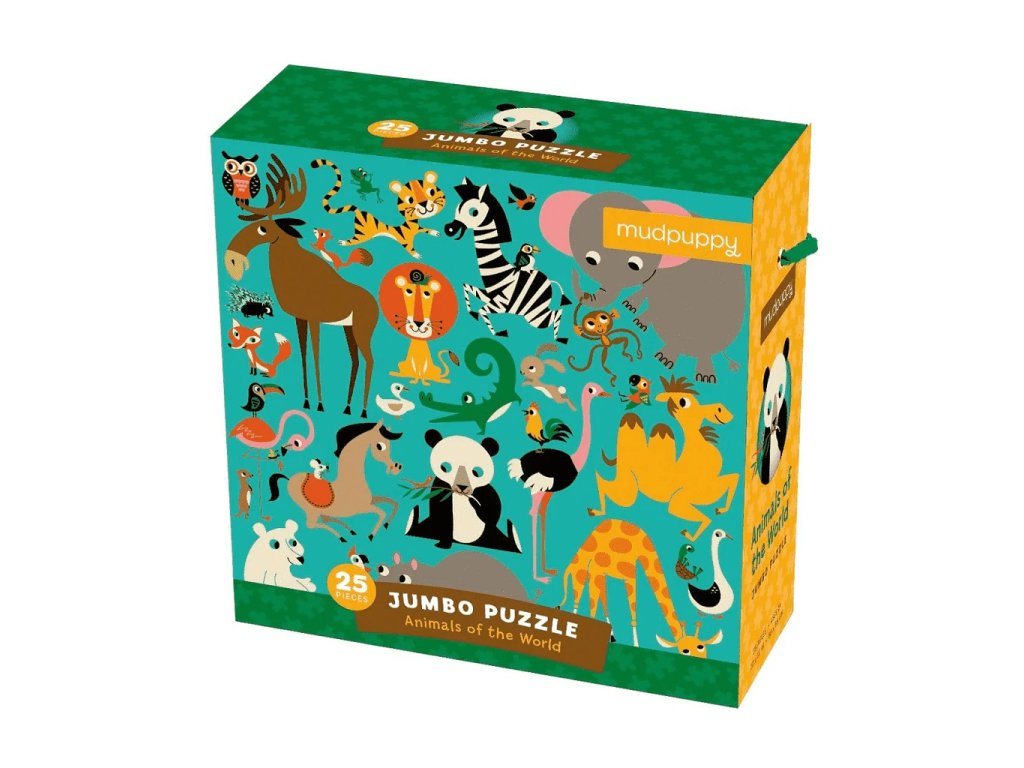 Představujeme Vám pestrou kolekci zvířat z celého světa. Amy Blay ilustrovala hrocha, ledního medvěda, žirafu, velblouda, pštrosa, pandu, koně, losa, lva, krokodýla, slona, opici, zebru, tygra a další. Puzzle obsahuje 25 jumbo dílků zabalených v pevné krabičce s provazovou rukojetí. Hlavní vlastnosti: obsahuje 25 jumbo dílkůpotištěno netoxickými inkousty na bázi sójirozvíjí logické myšlení a motoriku všechny produkty Mudpuppy splňují bezpečnostní normy CPSIA, ASTM, CE