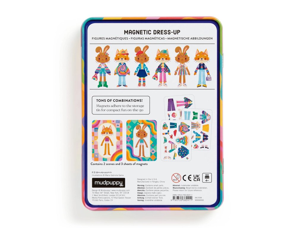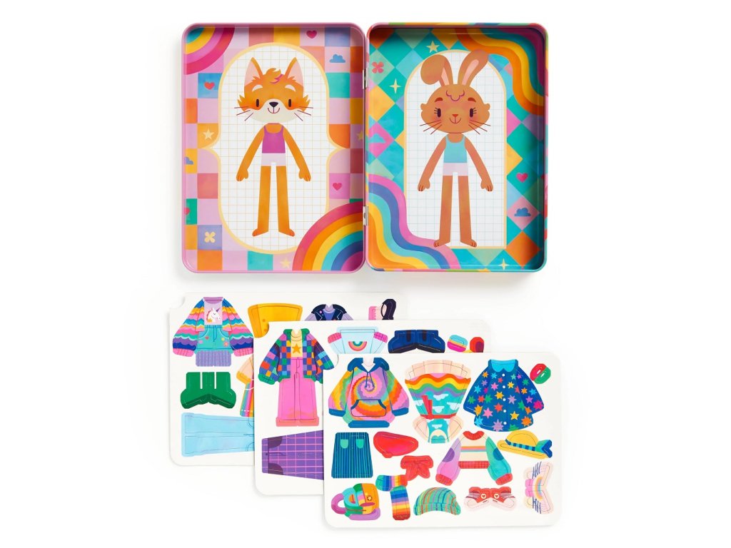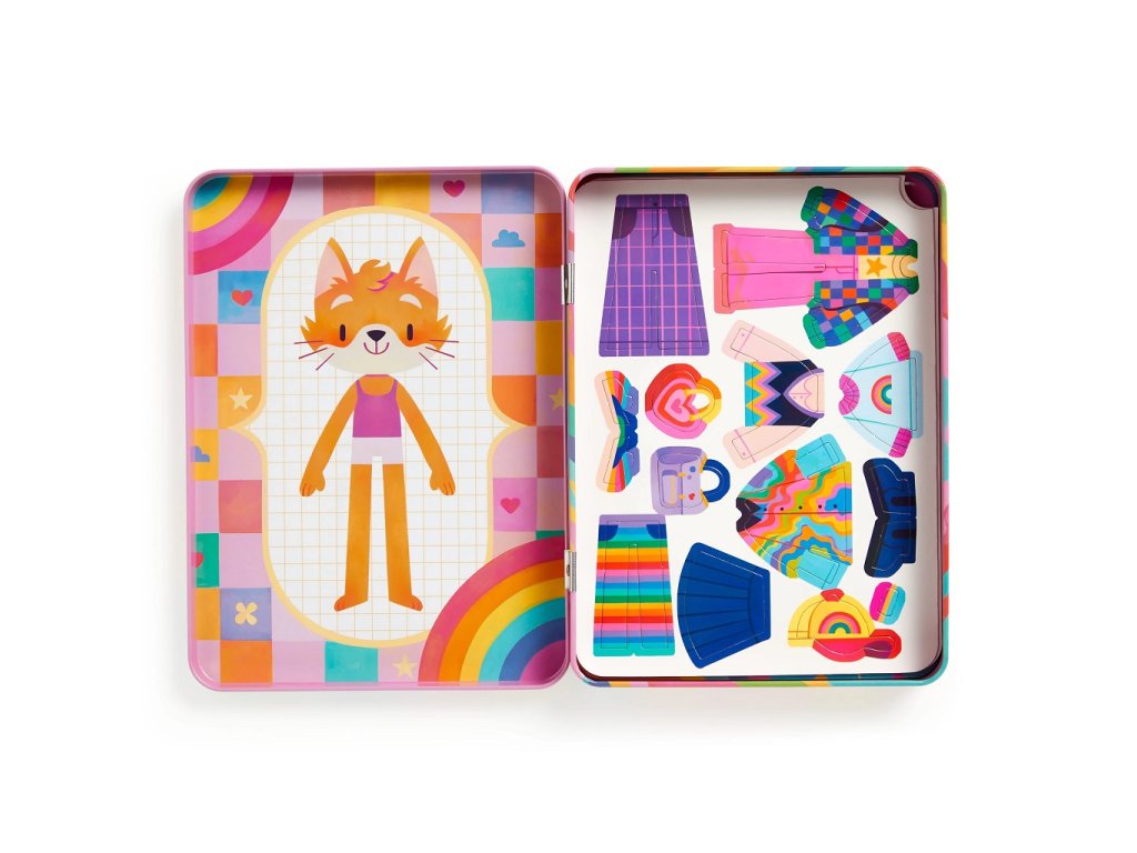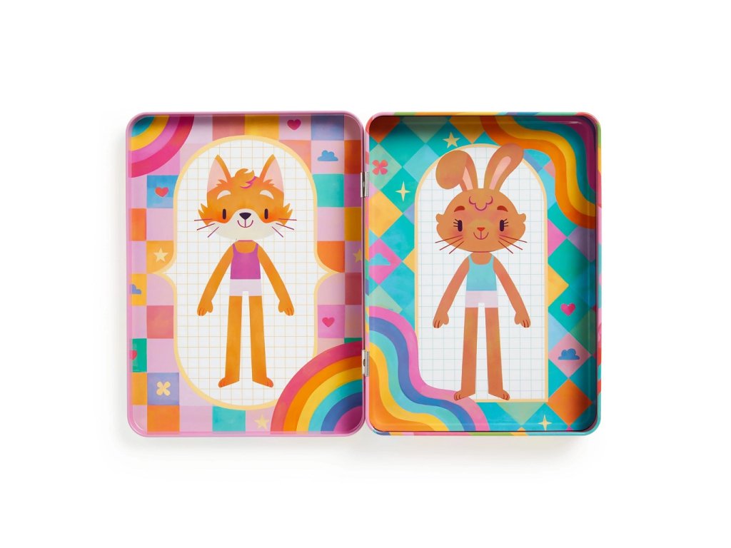 Tato magnetická herní sada obsahuje 2 ilustrované scény se dvěmi postavičkami (lišky a zajíčka) a 3 listy duhově barevných magnetů na vytváření vlastních outfitů. Jednotlivé magnety přilnou k plechovému obalu a děti si tak mohou obléknout své zvířatko podle své fantazie. Tato hra nabízí hodiny nápaditého hraní, při kterém děti rozvíjí představivost a kreativitu. Pevný plechový obal se snadno sbalí do batůžku jako cestovní hračka. Hlavní vlastnosti: cestovní hračka v kovové krabičcekreativní a interaktivní hračkanatištěno netoxickými barvami45 ks různě barevných magnetů2 ilustrované scényhra splňuje bezpečnostní normy CPSIA, ASTM, CE