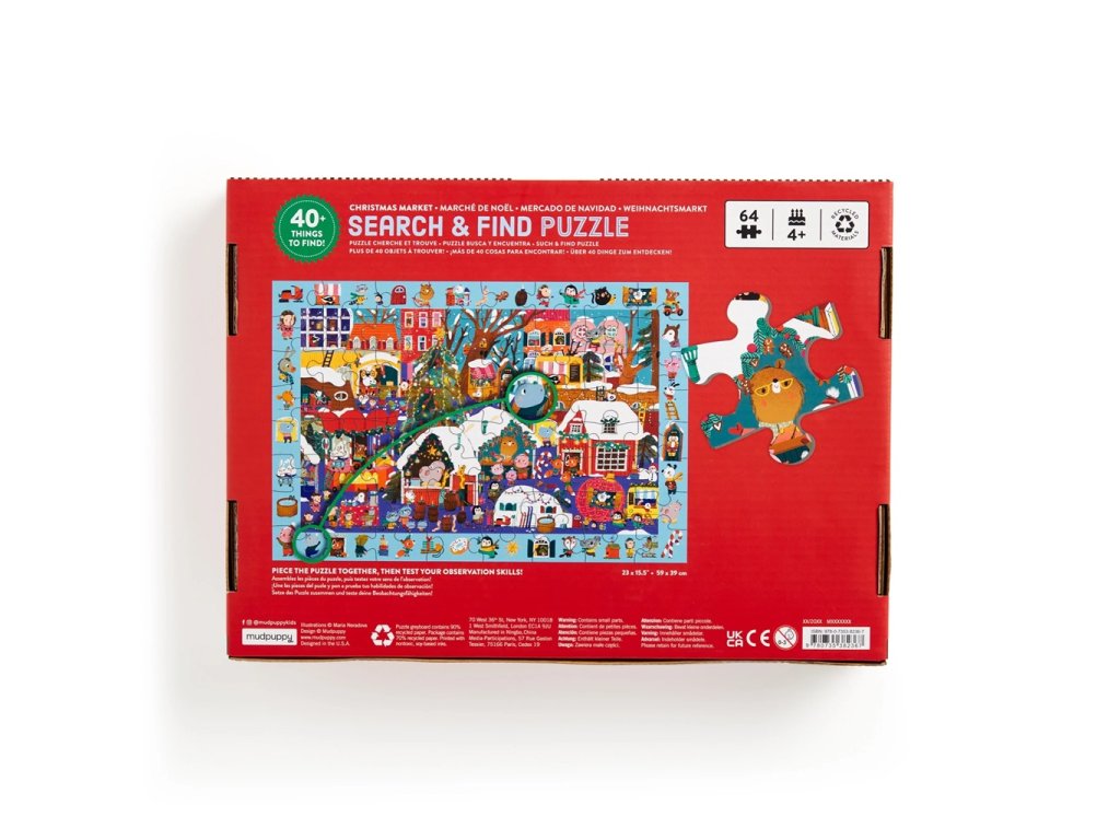 Děti si zamilují krásné obrázky vánočních obchůdků a výzdoby roztomilého zvířecího městečka, které se připravuje na svátky! Nejprve si děti mohou poskládat 64dílnou skládačku s pestrou sbírkou vánoční atmosféry. Skládání puzzle je teprve začátek zábavy! Až bude hotové, mohou děti zapojit své bystré oči a hledat více než 40 vánočních zvířátek a předmětů, které jsou namalované kolem obrázku a všechny se dají najít i přímo v puzzle! Dokážete je všechny objevit? Hlavní vlastnosti: 64 dílkůilustrace Maria Neradovapečlivě vybraný motiv od renomovaných umělcůvyrobeno s použitím recyklovaných a udržitelně získaných materiálůpotisk a provedení v nejvyšší kvalitěrozvíjí kognitivní schopnosti, logické myšlení, udržení pozrornostiprocvičuje psychomotorických dovednostivhodné od 4 let