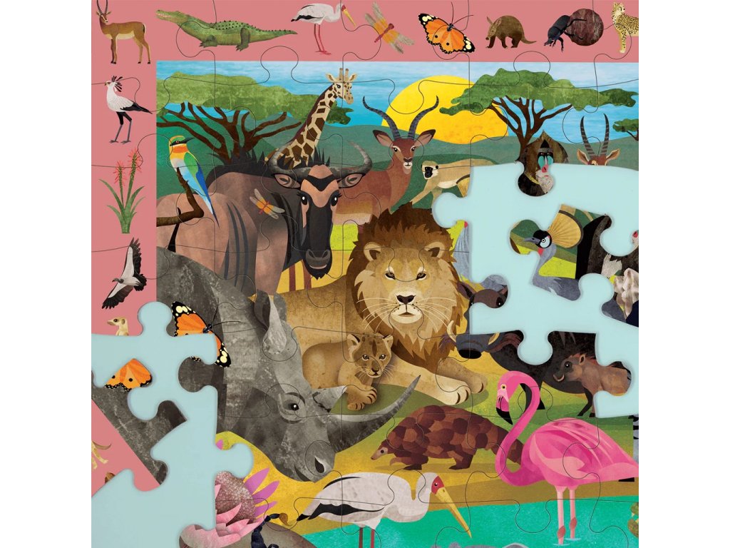 Puzzle "skládej a hledej" od Mudpuppy je zábavné puzzle se 64 dílky a také dvojnásobná zábava, která kombinuje skládání puzzle s rozmanitými zvířaty žijícími v africkém safari a hledání skrytých předmětů v jednom obrázku. Tato skládačka přináší dobrodružný zážitek prostřednictvím obrázku. Nejprve si děti mohou poskládat puzzle. Po složení si děti mohou vyzkoušet své pozorovací schopnosti a najít více než 40 skrytých předmětů v ohraničení kolem obrázku. Jsou tam všechny, můžete je najít? Puzzle jsou vyrobeny za použití významného podílu recyklovaného papíru a nabízí špičkový potisk nezávadnými barvami. Jsou opatřeny matnou povrchovou úpravou, která zajišťuje za všech okolností věrné podání detailů i barev. Jejich zadní strana je potažena hladkým, na dotek příjemným povrchem, díky němuž se při skladování rozloženého puzzle netvoří prach. Spolu s pečlivě zabalenými dílky naleznete v balení také letáček s návodným obrázkem, který zpravidla obsahuje další informace o tvůrcích a pozadí vzniku díla. Dodáváno v mimořádně pevné a poutavě zpracované kartonové krabičce vyrobené z recyklovaného kartonu. Hlavní vlastnosti: 64 precizně vyřezaných dílkůvyrobeno s použitím recyklovaných a udržitelně získaných materiálůpečlivě vybraný motiv od renomovaných tvůrců a umělcůpotisk a provedení nejvyšší kvalityobsahuje návodný obrázek