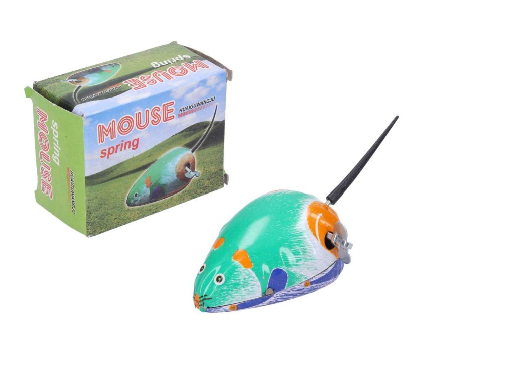 Pohyb plechové myšky zajišťuje pérový strojek natahovaný klíčkem.