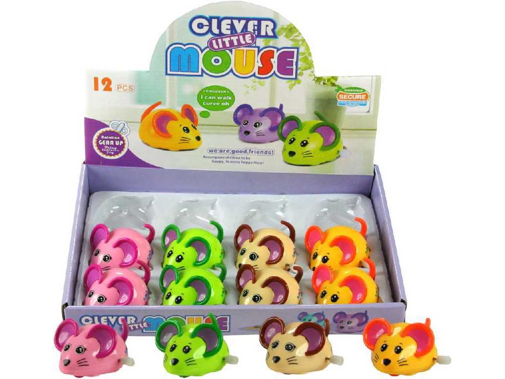 Natahovací dětská hračka na klíček. Malá myška z plastu, ve čtyřech barevných provedeních, která se po natažení na klíček pohybuje a hýbe ocáskem.