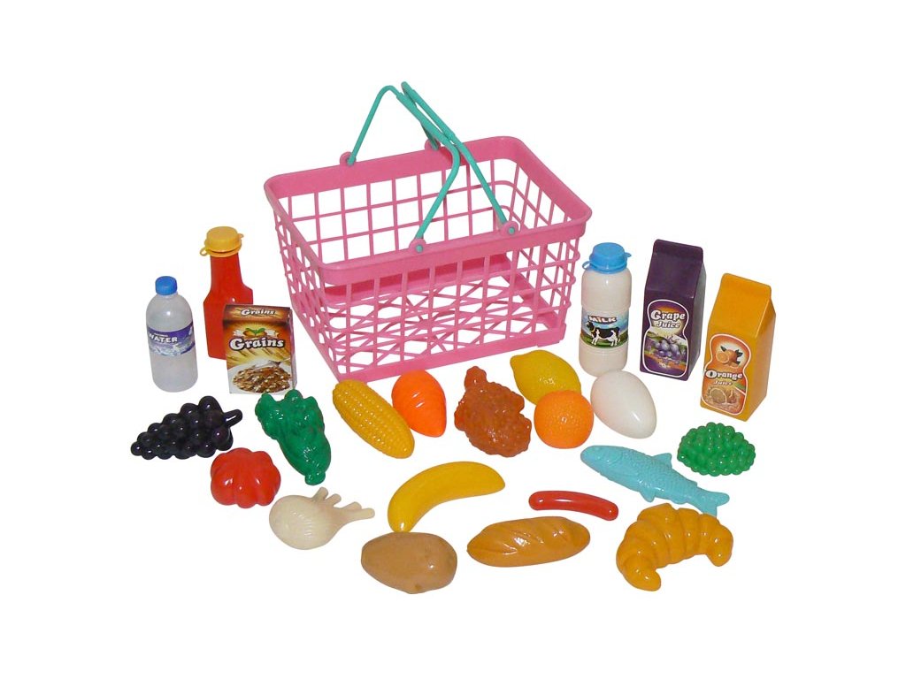 - Nákupní košík z plastu, který obsahuje 25 kusů potravin, které můžete koupit v supermarketu. - V praktickém plastovém košíku najdeš makety běžných potravin jako jsou: mléko, ovoce a zelenina, ketčup, pečivo, maso, ryba, balenou vodu, vejce, ... - Hračka je vyrobená z vysoce kvalitního plastu. - Rozměry košíku: 23x12,5x16,5cm - Věk 3+