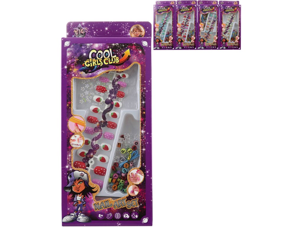 Dětské nalepovací nehty, součástí samolepky, pilník a korálky (s písmenky) s provázkem na výrobu náramku. 4 varianty provedení.