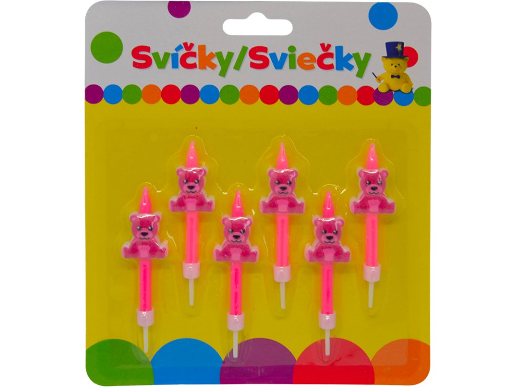 Narozeninová svíčka s růžovým MEDVÍDKEM a držákem 6ks