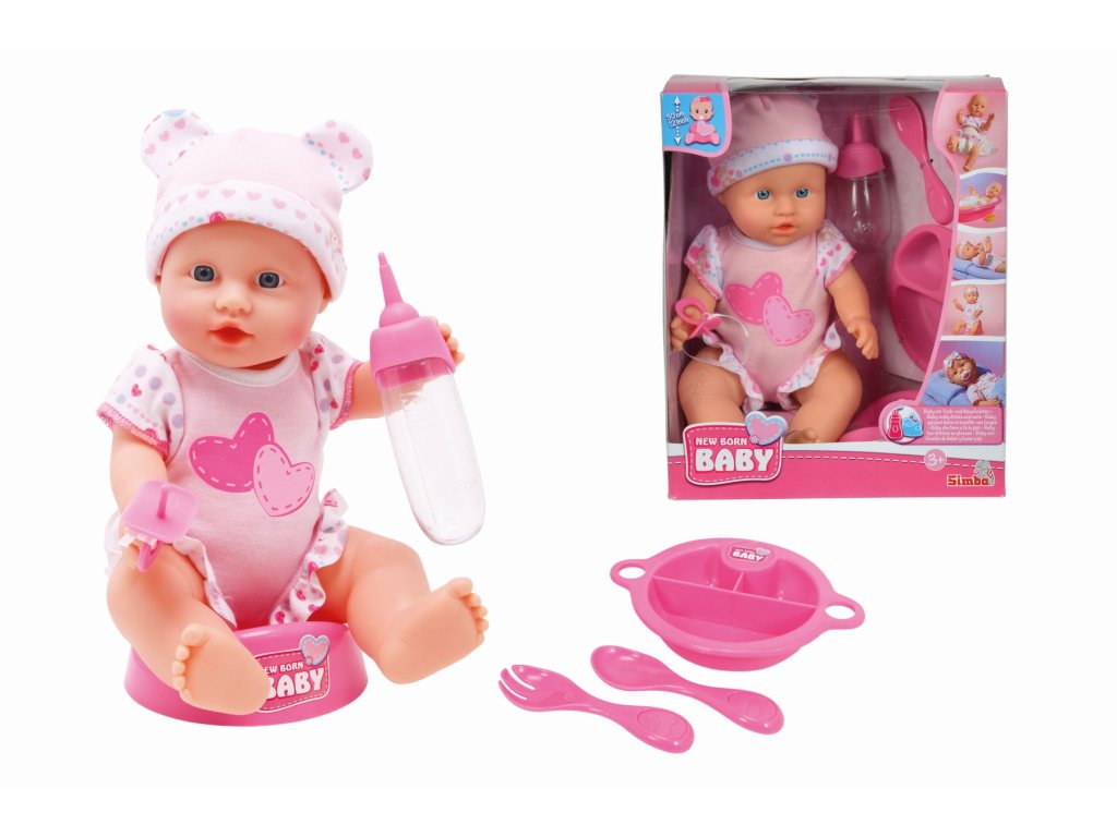 Panenka s plastovým tělíčkem z řady New Born Baby s funkcí "pije a čůrá". Součástí 7 ks příslušenství, např.