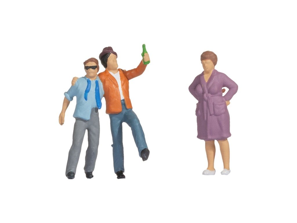 Sada figurek Veselí kamarádi přináší na vaši modelovou železnici zábavnou a velmi realistickou scénku. Dva dobří kamarádi si zjevně užili příjemný večer a teď se v dobré náladě, ruku v ruce a s lahví v ruce, vracejí domů. Na jejich návrat už ale čeká třetí postava – rázná paní v županu se založenýma rukama a přísným pohledem. Je zřejmé, že z jejich nočního výletu není zrovna nadšená. Tato humorná scénka se skvěle hodí do městských nebo vesnických zákoutí vašeho kolejiště a zaručeně vykouzlí úsměv na tváři každého pozorovatele. Veselí kamarádi vnáší do modelového světa kousek každodenního života s nadhledem a vtipem. Hlavní vlastnosti: jedná se o model, nejedná se o hračkuručně kolorovánovhodné od 14 letměřítko H0