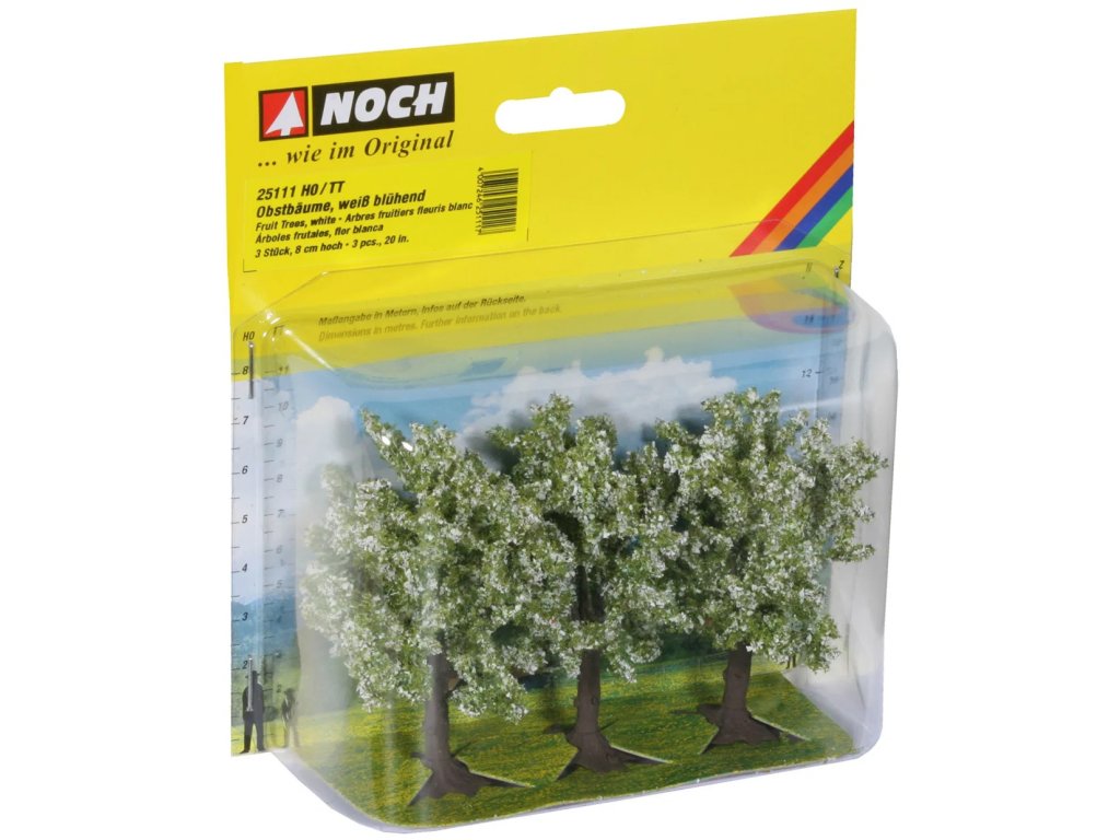 Ovocné stromy se skvěle hodí do každé modelové scenérie, kde je cílem vytvořit co nejvěrnější a nejidylčtější atmosféru. Sladké plody přímo ze stromu potěší každého, ať už jde o jablka, hrušky, třešně, švestky nebo blumy, možností je nespočet.Dají se zasadit téměř kamkoli – do zahrady, parku nebo na venkovské pole. Nevyžadují mnoho prostoru, a přesto dokáží vykvést a vyrůst do krásy. Při tvorbě modelové scenérie dodají tyto stromy celé krajině přirozený a živý ráz. Jsou nepřehlédnutelným prvkem, který upoutá pozornost na každém modelovém kolejišti či scenérii. Hlavní vlastnosti: jedná se o model, nejedná se o hračkuvhodné od 14 letpro měřítka H0, TTsada 3 ks