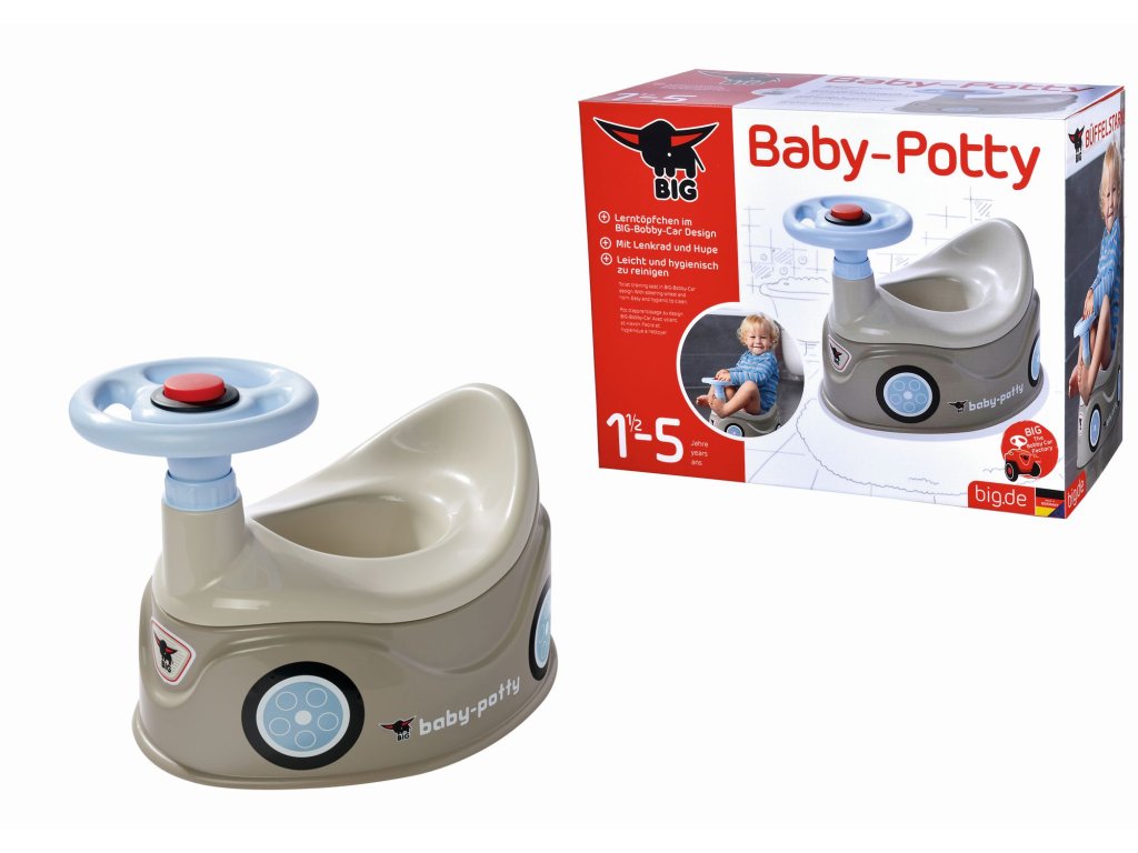 Big s volantem a s klaksonem. Vyšší opěrka zad, široká, stabilní základna. Barva šedá. Rozměry: 43 x 28 x 31 cm.