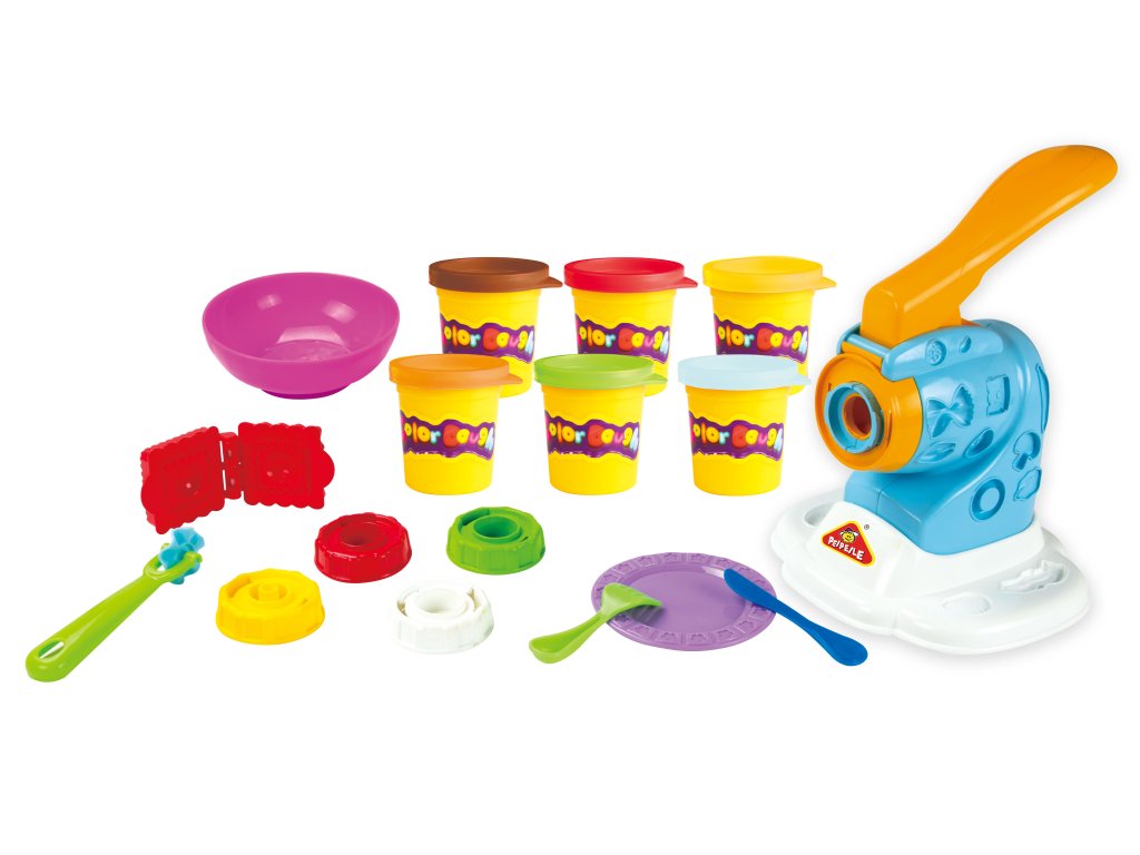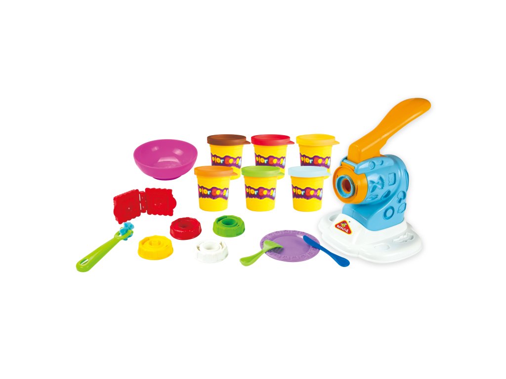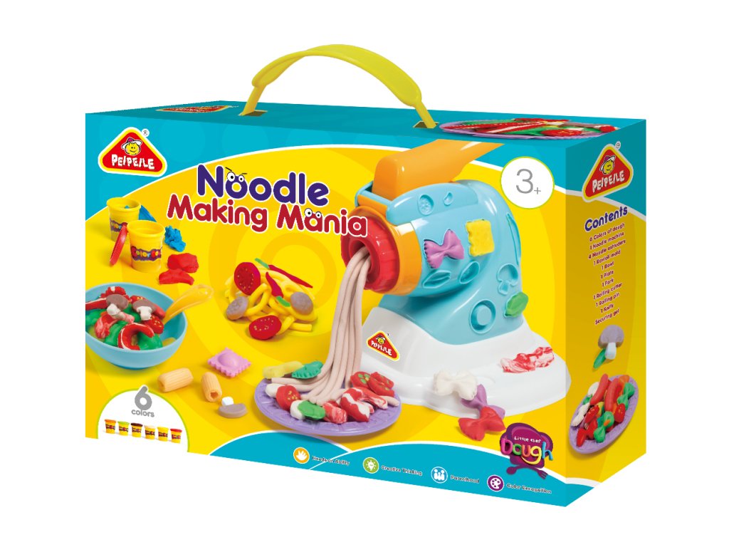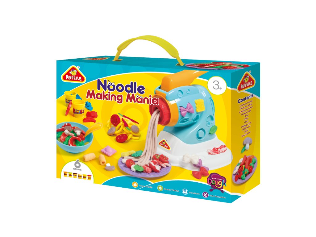 Sada pro výrobu nudlí. Hmota je bezpečná, netoxická, měkká a pružná. Hmota nevysychá, pokud je uchovávaná v dobře uzavřeném kelímku a je možné jí používat znovu a znovu. Sada obsahuje 6 kelímků s modelínou, strojek na výrobu nudlí, příslušenství.