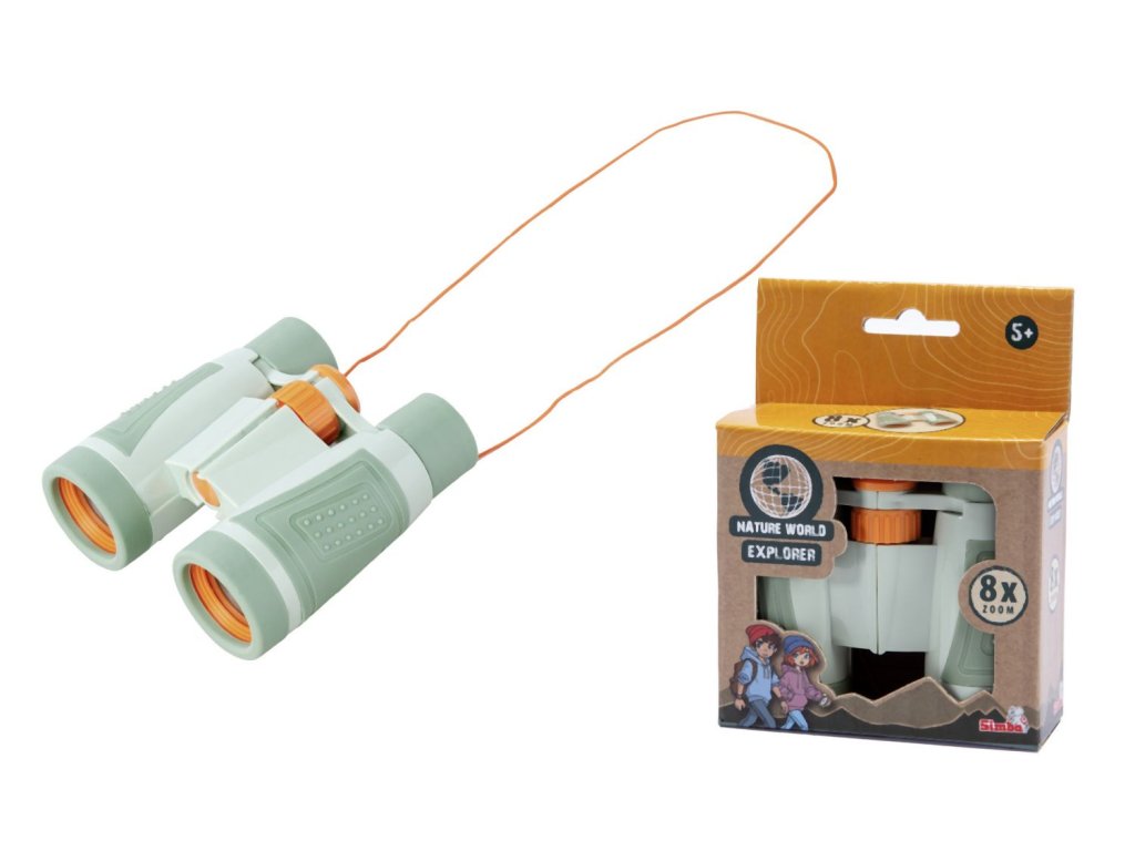 Dalekohled se zvětšením až 8x, se šňůrkou na krk. Velikost dalekohledu 11 cm.