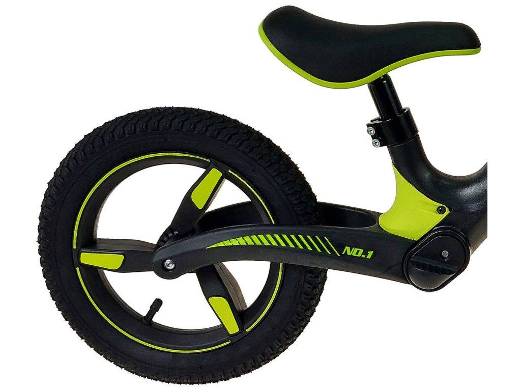 Černé dětské odrážedlo (odstrkovadlo) Adar, nastavitelné sedadlo, nafukovací 12" kola, délka 87cm, nosnost do 30kg, pro děti od 2 let.