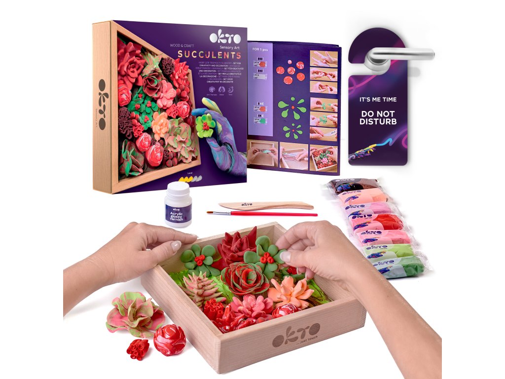 OKTO Passion Výtvarná modelovací sada sukulenty v dřevěném rámu 21x21 cm. Úroveň obtížnosti 5/5. Velikost rámu 21x21 cm. Obsah balení - přírodní plátno, návod, dřevěný tvarovací nástroj, štětec, sada modelovacích hmot různých barev.