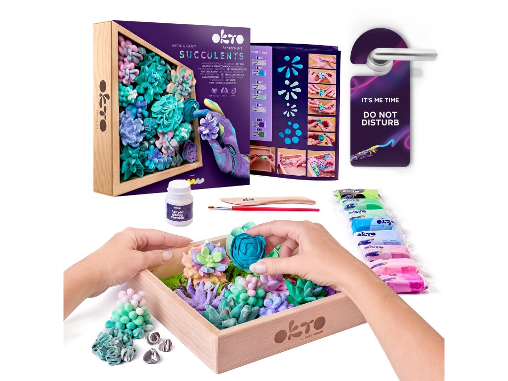 OKTO Tenderness Výtvarná modelovací sada sukulenty v dřevěném rámu. Velikost rámu 21x21 cm. Samotvrdnoucí hmota (air clay). Obsah balení - dřevěný rám 210x210x50 mm, samotvrdnoucí hmota, tvarovací nástroj, štětec, obrázkový návod.