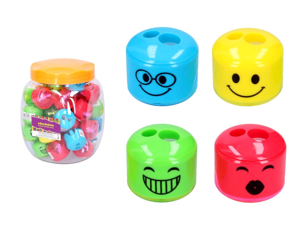 Ořezávátko na dvě tužky o velikosti 4x4x3,7 cm se zásobníkem.