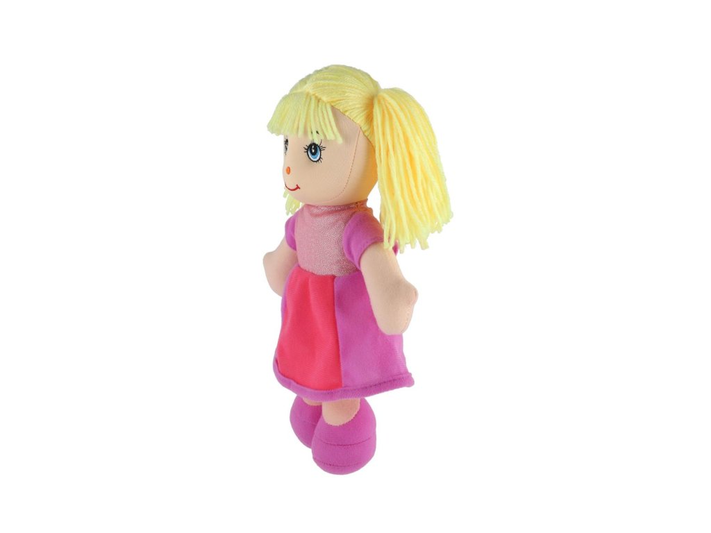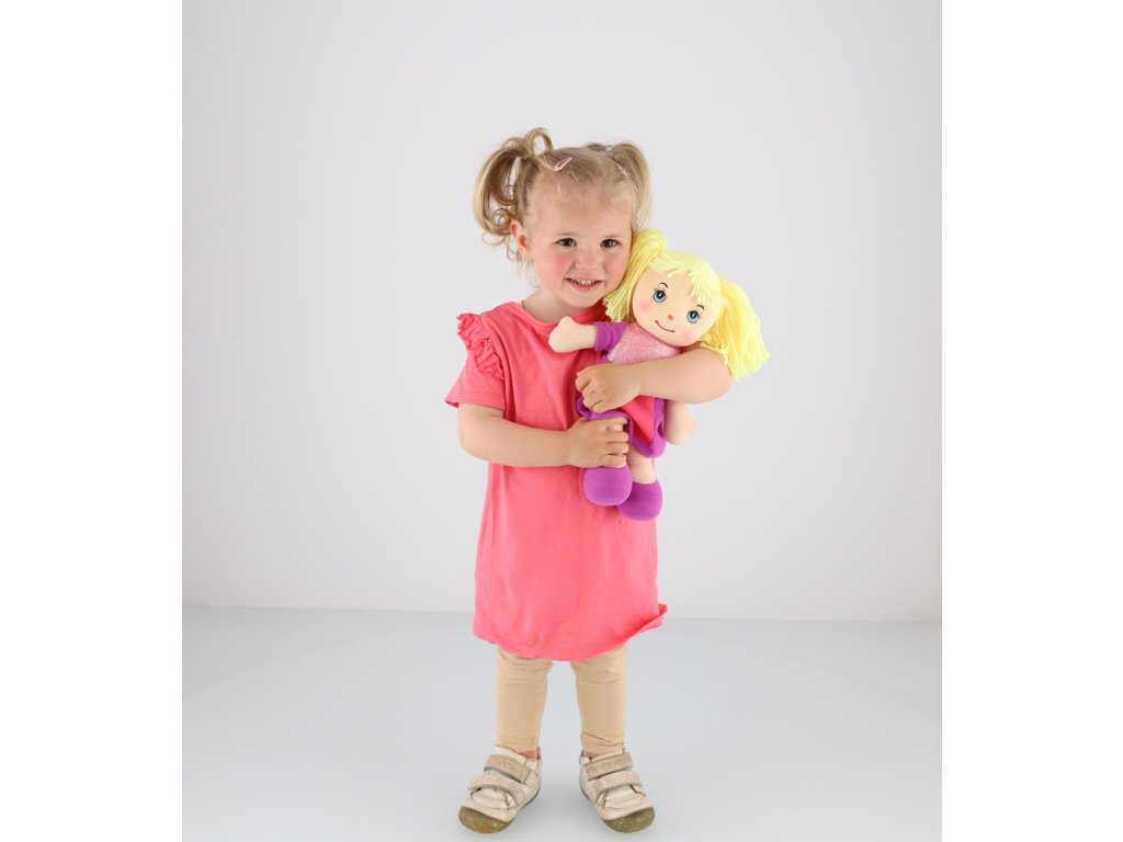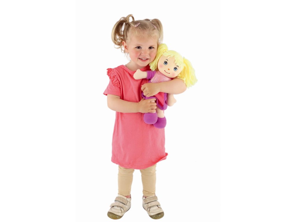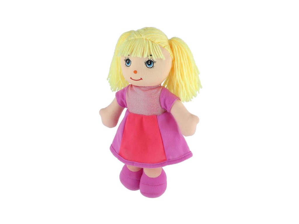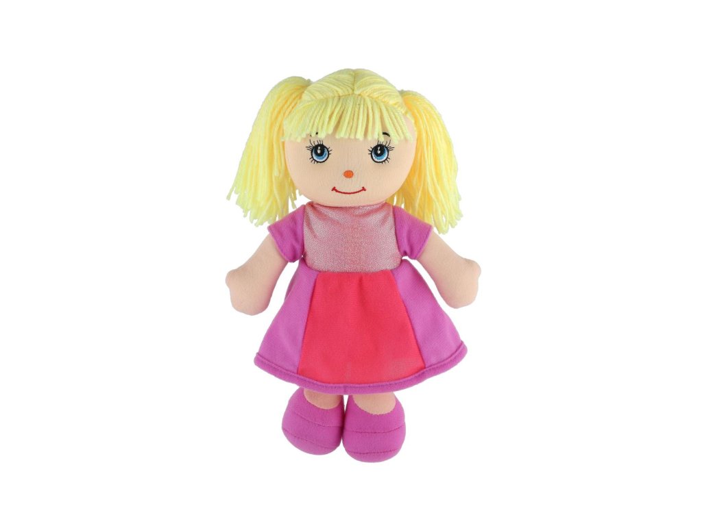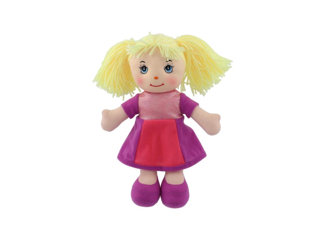 Panenka látková s blond culíky v šatičkách. Díky měkkému tělíčku i hlavičce může být kamárdkou nejen při hraní, ale také při usínání.