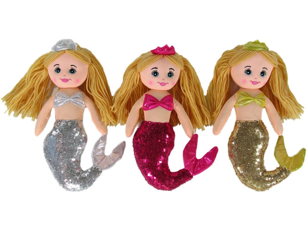 Lehká usměvavá látková panenka mořská panna, s měkkým tělíčkem, se třpytivými detaily, s flitry, ve třech barevných variantách.