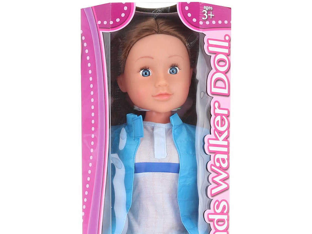 Krásná velká chodící panenka s tmavě hnědými vlásky. Panenka má pohyblivé nohy a ruce a lze s ní chodit - držením za ruce a tažením panenky vpřed se automaticky pohybují i nohy. (mechanická