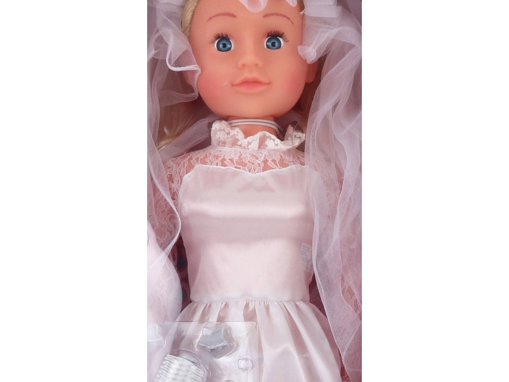 Krásná velká chodící panenka ve svátečních, bílých svatebních šatech. Panenka má pohyblivé nohy a ruce a lze s ní chodit - držením za ruce a tažením panenky vpřed se automaticky pohybují i nohy. (mechanická