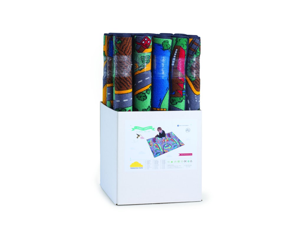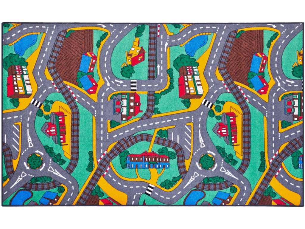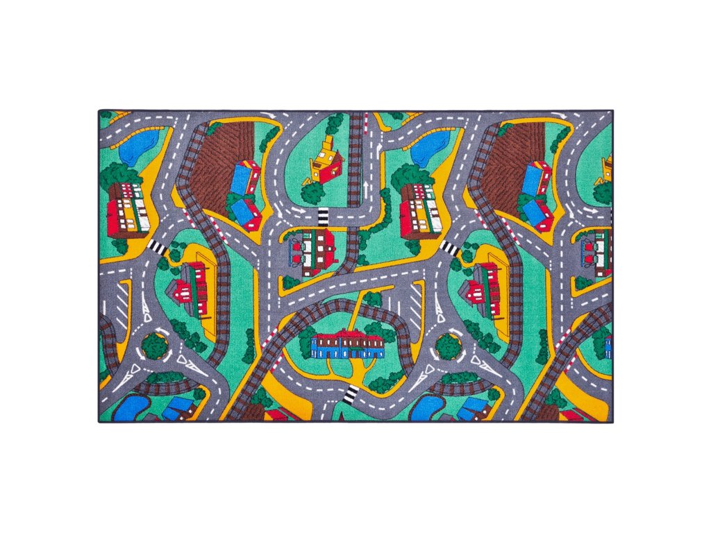 Hrací koberec silnice, domy, příroda velký. Barevný koberec je spodní strany opatřen antiskluzovou vrstvou. Rozměr koberce je 95×200 cm. Vyrobeno v EU.