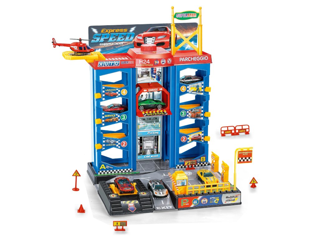 Parkovací stanice se 3 kovovými auty a vrtulníkem. Rozměry 30x27x37 cm. Velikost auta 7 cm. Stanice obsahuje 3 kovová auta, 1 kovový vrtulník, ruční výtah, heliport, čerpací stanici, závoru. Posunutím páčky v daném parkovacím místě - uvolnění auta z parkovacího místa.