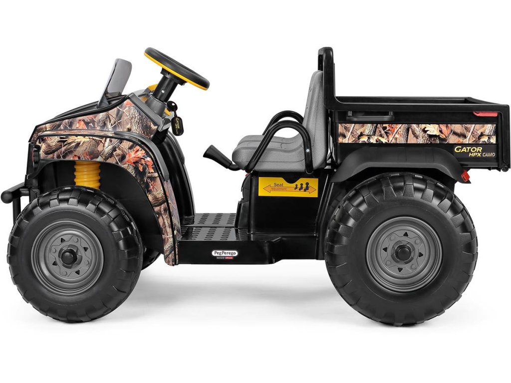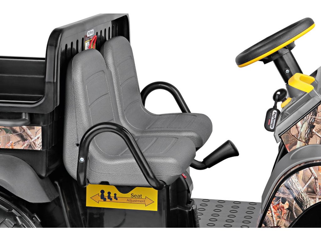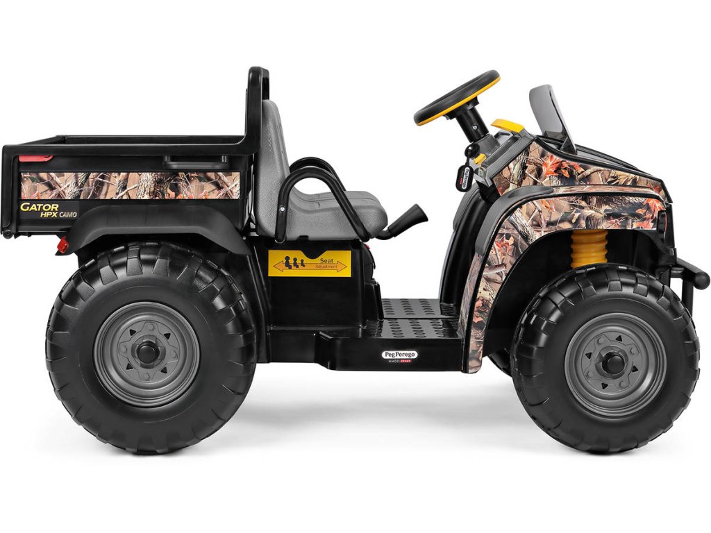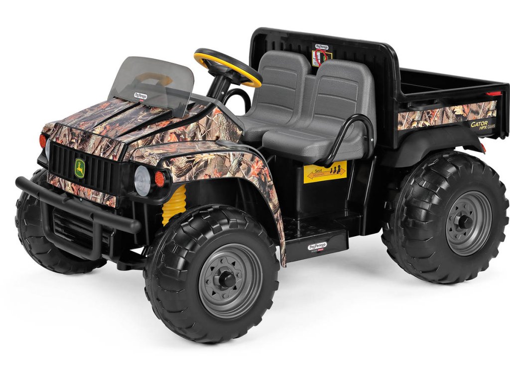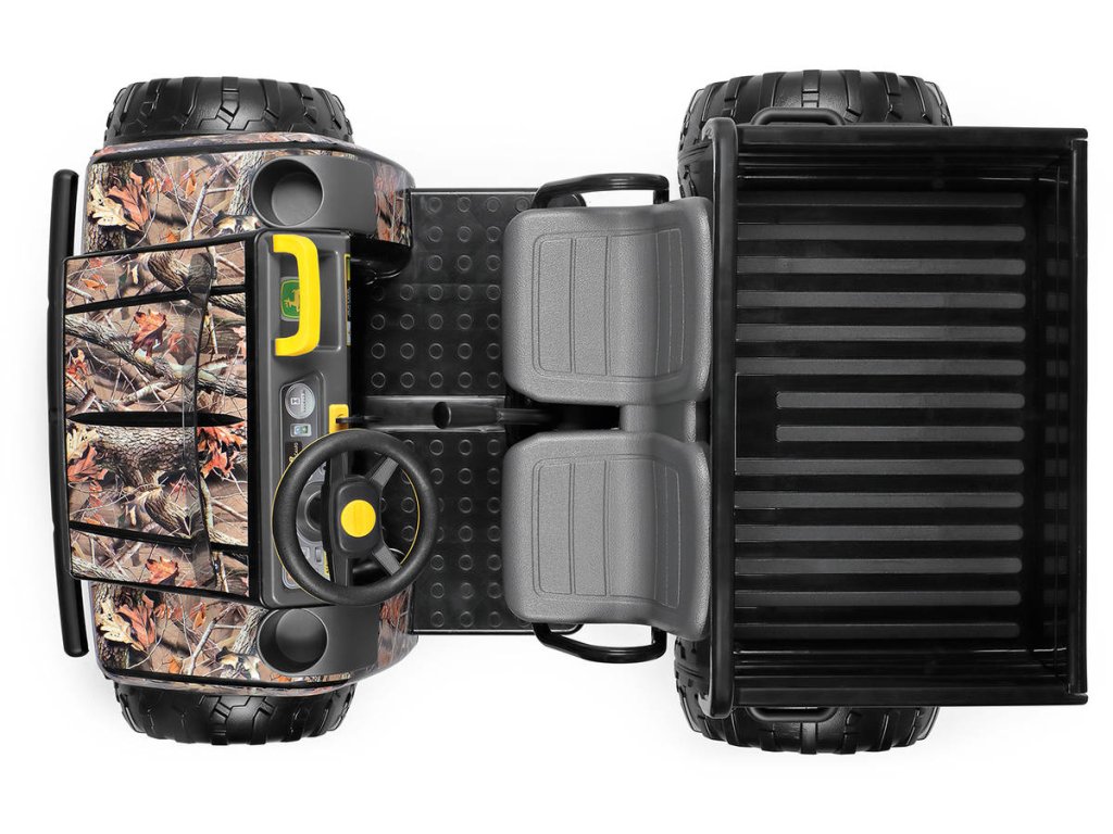 Elektrické vozítko JOHN DEERE GATOR CAMO od Peg Pérego. Dvoumístné terénní auto, 2 motory, 2x 175W, baterie 12V, rychlost 6,8km/h, nosnost 60kg. Velmi kvalitní, značkový výrobek.