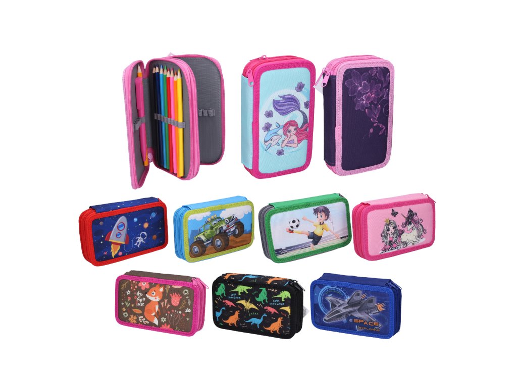 Dvoupatrový penál s výbavou je určen pro žáky základní školy. Každé jednotlivé patro se uzavírá na samostatný zip. Pouzdro má pružné gumové poutka pro uložení psacích potřeb.