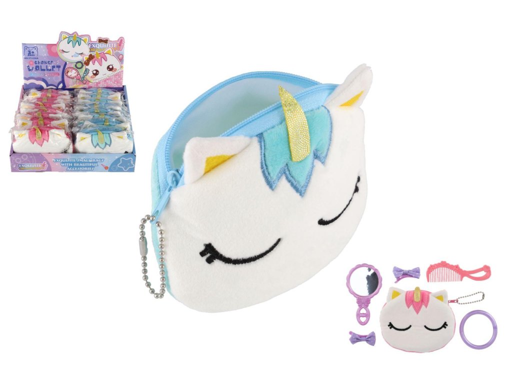 Peněženka dívčí jednorožec semiš 12x10cm s doplňky do vlasů 2 barvy v sáčku 16ks v boxu