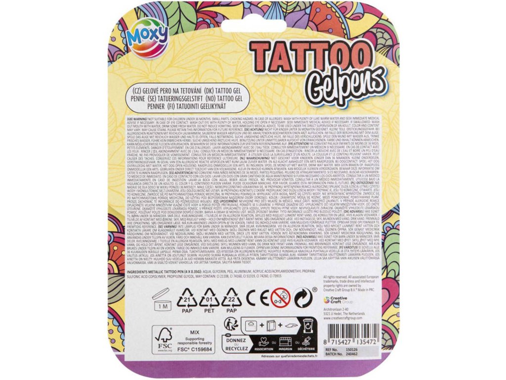 Sada čtyř metalických tetovacích gelových per v různých barvách se šablonami. Tetovací gelová pera, díky kterým si můžete jednoduše vytvořit vlastní parádní třpytivé tetování. Vytvořte si vlastní tetování. Sami si určíte, kam a jaké tetování umístíte a jakou barvu mu dáte! Umístěte šablonu na své tělo a vybarvěte ji. Sada obsahuje list šablon a 4 gelová pera v barvách modré, fialové, zelené a oranžové.