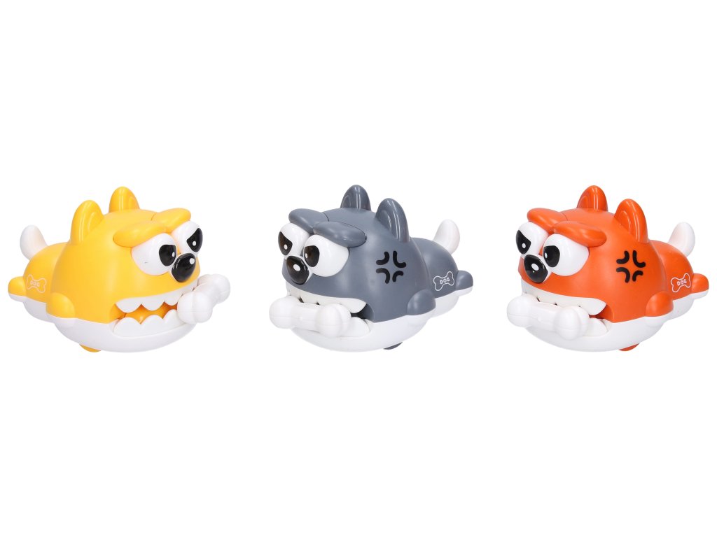 Pes s kostí natahovací. Velikost 8cm. Natahuje se zatažením za kostičku. Potom jede pes dopředu kost honí. Display box - 12 ks. 3 varianty - šedá, oranžová, žlutá.
