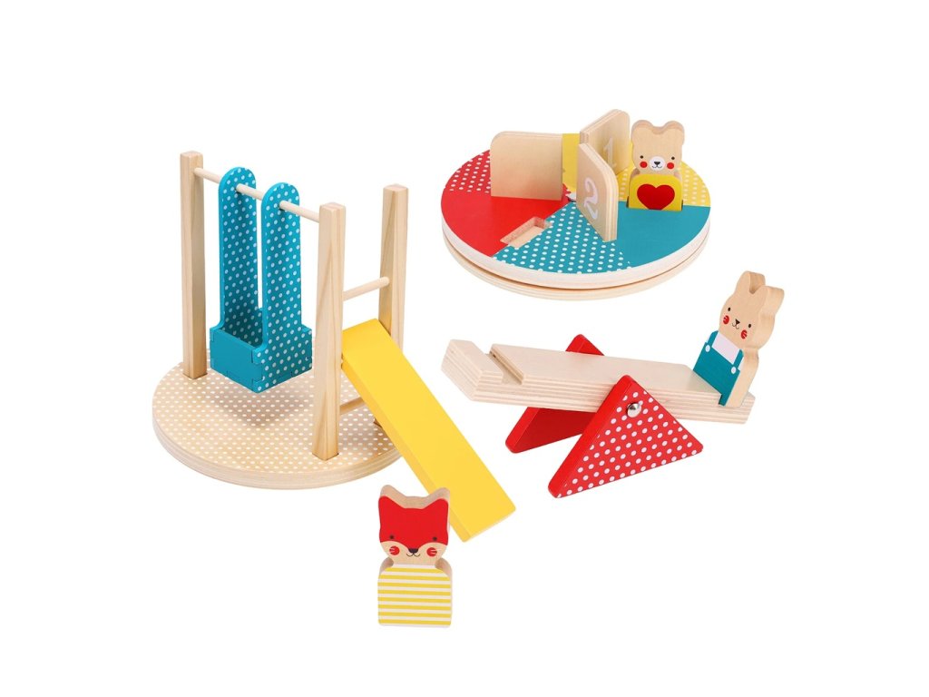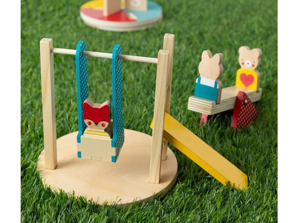 Pojďte si pohrát na hřiště se zvířecími kamarády liškou, medvědem a zajíčkem! Díky zábavným atrakcím včetně kolotoče, houpačky a houpačky se skluzavkou a třem zvířecím postavičkám si děti užijí spoustu zábavy. Pohoupejte se na houpačkách, sjeďte ze skluzavky nebo se točte na kolotoči. Dřevěná sada zlepšuje jemnou motoriku, prohlubuje pochopení příčiny a následku, rozvíjí emoční vnímání a podporuje samostatné hraní. Je vyrobena z FSC® dřeva a FSC® papíru, obal je potištěn s využitím 75 % recyklovaných materiálů a je plně recyklovatelný. Obsah balení: houpačka se skluzavkou, houpačka, kolotoč, 3 postavičky zvířátek – liška, medvídek, zajíček. Hlavní vlastnosti: vyrobeno z FSC® dřeva a FSC® papíruplně recyklovatelný obalrozvíjí jemnou motoriku podporuje samostatné hraní vhodné od 3 let Značka a certifikát FSC® (Forest Stewardship Council) zaručuje, že dřevo, ze kterého byl produkt vyroben, nebylo vytěženo nelegálně a pochází z lesů obhospodařovaných šetrným či přírodě blízkým způsobem, ve kterém jsou dodržovány přísné environmentální a sociální požadavky. Značka FSC® na výrobku znamená, že svým nákupem pomáháte chránit lesy a podporujete šetrné, odpovědné či přírodě blízké hospodaření, díky kterému jsou naše lesy stabilnější, zdravější, mají přirozenou druhovou skladbu a lépe odolávají negativním následkům klimatických změn.