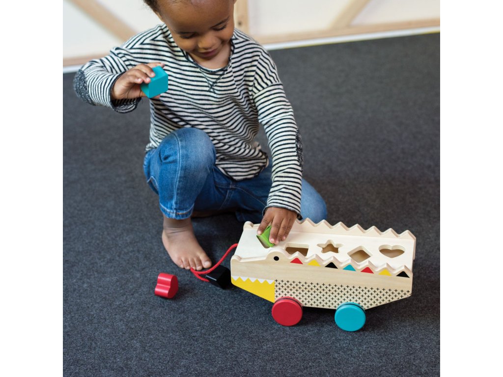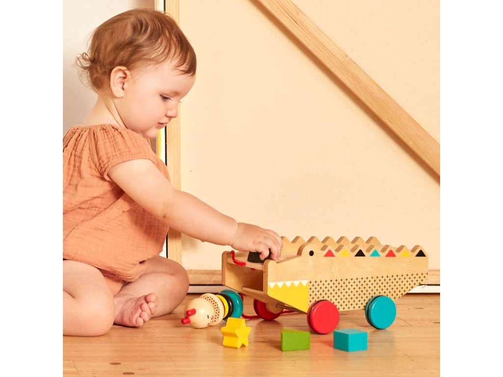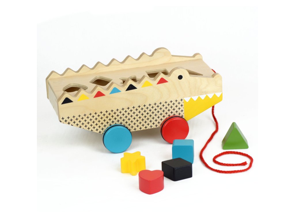Aligátor je tahací hračkou a vkládačkou v jednom. Pět zavalitých kostek různých tvarů lze jednoduše vložit do otvorů v aligátorovi. Hračka stojí na čtyřech barevných a pogumovaných kolech, které zajišťují hladký pohyb po domácích podlahách. Hračka je vyrobena z odolného dřeva, a tak Vám jistě vydrží po mnoho let. Hlavní vlastnosti: rozvíjí koordinaci ruka-okopodporuje poznávání barev a tvarůšňůrka na tahání a kvalitní kolečka nabádají batolata k chůzivyrobeno z kvalitního dřeva z odpovědných zdrojů a netoxických barev na bázi vodysplňuje všechny bezpečnostní normy Značka a certifikát FSC® (Forest Stewardship Council) zaručuje, že dřevo, ze kterého byl produkt vyroben, nebylo vytěženo nelegálně a pochází z lesů obhospodařovaných šetrným či přírodě blízkým způsobem, ve kterém jsou dodržovány přísné environmentální a sociální požadavky. Značka FSC® na výrobku znamená, že svým nákupem pomáháte chránit lesy a podporujete šetrné, odpovědné či přírodě blízké hospodaření, díky kterému jsou naše lesy stabilnější, zdravější, mají přirozenou druhovou skladbu a lépe odolávají negativním následkům klimatických změn.