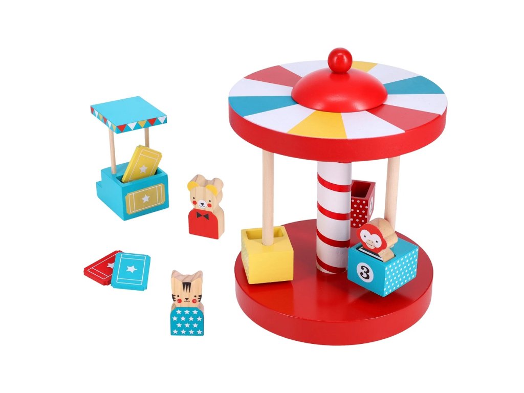 Dostaňte se na pouť! Jste připraveni vzít opici, koťátko a medvěda na kouzelnou jízdu? Jednoduše vhoďte lístky do stánku, posaďte své zvířecí kamarády na sedadla a otáčejte střechou, aby se kolotoč roztočil! Tato krásná dřevěná hračka rozvíjí dovednosti v řešení problémů, prohlubuje pochopení příčiny a následku a podporuje nápadité vyprávění a samostatnou hru. Vhodná je pro děti od 2 let. Dva díly kolotoče se dají zasunout do sebe, takže nevyžadují žádné nástroje, a kolotoč je připraven rovnou ke hraní. Tři dřevěné zvířecí postavičky lze použít k obsluze pokladny, k jízdě na kolotoči nebo v samostatných scénách, které si dítě samo vytvoří. Navíc tři vstupenky a očíslovaná sedadla lze využít k rozvoji počítání a numerických dovedností. Hlavní vlastnosti: kolotoč se třemi sedátky, stánek na lístky, 3 ks lístků, 3 postavičkybarevný designrobustní konstrukceperfektní hračka na hraní i na vystavenívyrobeno z FSC dřeva Značka a certifikát FSC® (Forest Stewardship Council) zaručuje, že dřevo, ze kterého byl produkt vyroben, nebylo vytěženo nelegálně a pochází z lesů obhospodařovaných šetrným či přírodě blízkým způsobem, ve kterém jsou dodržovány přísné environmentální a sociální požadavky. Značka FSC® na výrobku znamená, že svým nákupem pomáháte chránit lesy a podporujete šetrné, odpovědné či přírodě blízké hospodaření, díky kterému jsou naše lesy stabilnější, zdravější, mají přirozenou druhovou skladbu a lépe odolávají negativním následkům klimatických změn.