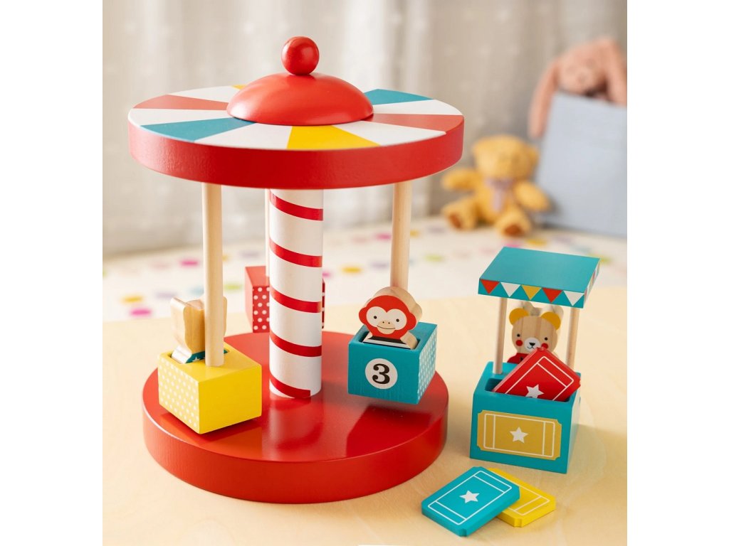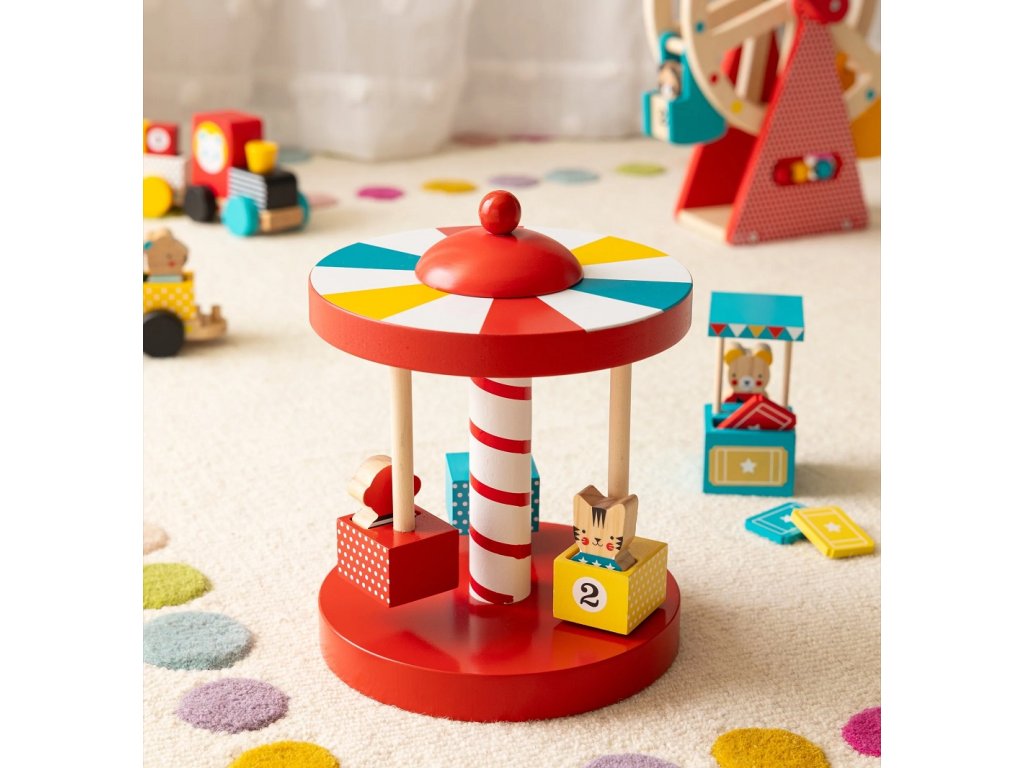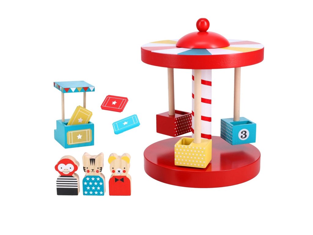 Dostaňte se na pouť! Jste připraveni vzít opici, koťátko a medvěda na kouzelnou jízdu? Jednoduše vhoďte lístky do stánku, posaďte své zvířecí kamarády na sedadla a otáčejte střechou, aby se kolotoč roztočil! Tato krásná dřevěná hračka rozvíjí dovednosti v řešení problémů, prohlubuje pochopení příčiny a následku a podporuje nápadité vyprávění a samostatnou hru. Vhodná je pro děti od 2 let. Dva díly kolotoče se dají zasunout do sebe, takže nevyžadují žádné nástroje, a kolotoč je připraven rovnou ke hraní. Tři dřevěné zvířecí postavičky lze použít k obsluze pokladny, k jízdě na kolotoči nebo v samostatných scénách, které si dítě samo vytvoří. Navíc tři vstupenky a očíslovaná sedadla lze využít k rozvoji počítání a numerických dovedností. Hlavní vlastnosti: kolotoč se třemi sedátky, stánek na lístky, 3 ks lístků, 3 postavičkybarevný designrobustní konstrukceperfektní hračka na hraní i na vystavenívyrobeno z FSC dřeva Značka a certifikát FSC® (Forest Stewardship Council) zaručuje, že dřevo, ze kterého byl produkt vyroben, nebylo vytěženo nelegálně a pochází z lesů obhospodařovaných šetrným či přírodě blízkým způsobem, ve kterém jsou dodržovány přísné environmentální a sociální požadavky. Značka FSC® na výrobku znamená, že svým nákupem pomáháte chránit lesy a podporujete šetrné, odpovědné či přírodě blízké hospodaření, díky kterému jsou naše lesy stabilnější, zdravější, mají přirozenou druhovou skladbu a lépe odolávají negativním následkům klimatických změn.