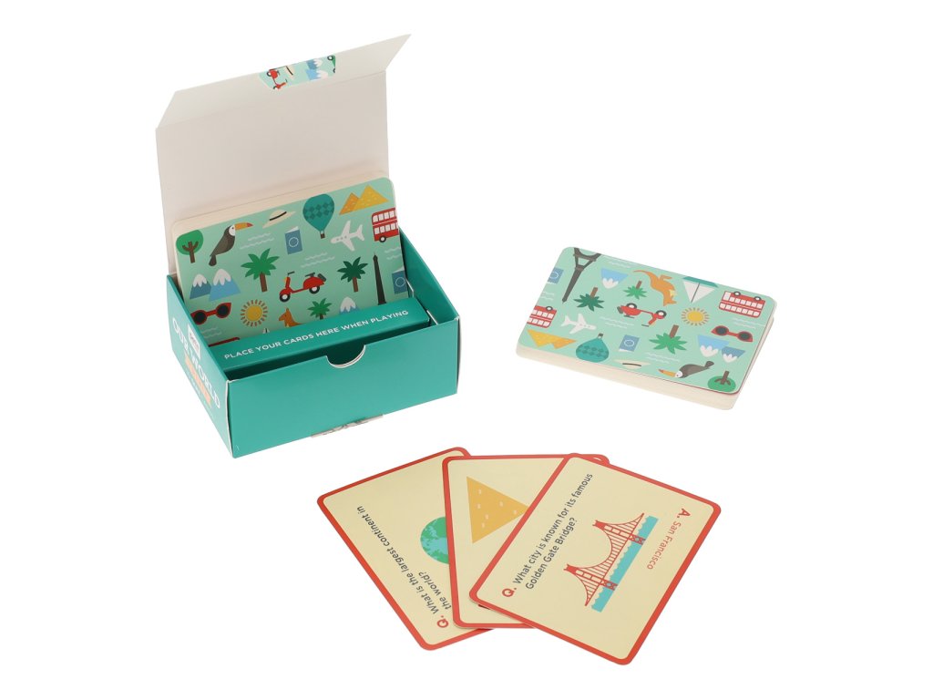 Staňte se světoběžníky s touto kvízovou hrou. Snadno s ní můžete dětem rozšířit obzory a pomáhat s učením, poslouží jako zpestření k listování atlasem, nebo cestování po glóbusu. Každá z originálně ilustrovaných karet obsahuje zeměpisnou otázku s odpovědí, například: „Které město je známé svým slavným mostem Golden Gate?“ Hra je v anglickém jazyce a je vhodnou pomůckou k procvičování angličtiny. Skvělá zábava na cesty i pro deštivé dny trávené doma! Hlavní vlastnosti:50 karet s kvízovými otázkamivhodné k procvičování angličtinyvyrobeno ze 100% FSC® certifikovaného papírupotištěno rostlinnými inkousty Značka a certifikát FSC® (Forest Stewardship Council) zaručuje, že dřevo, ze kterého byl produkt vyroben, nebylo vytěženo nelegálně a pochází z lesů obhospodařovaných šetrným či přírodě blízkým způsobem, ve kterém jsou dodržovány přísné environmentální a sociální požadavky. Značka FSC® na výrobku znamená, že svým nákupem pomáháte chránit lesy a podporujete šetrné, odpovědné či přírodě blízké hospodaření, díky kterému jsou naše lesy stabilnější, zdravější, mají přirozenou druhovou skladbu a lépe odolávají negativním následkům klimatických změn.