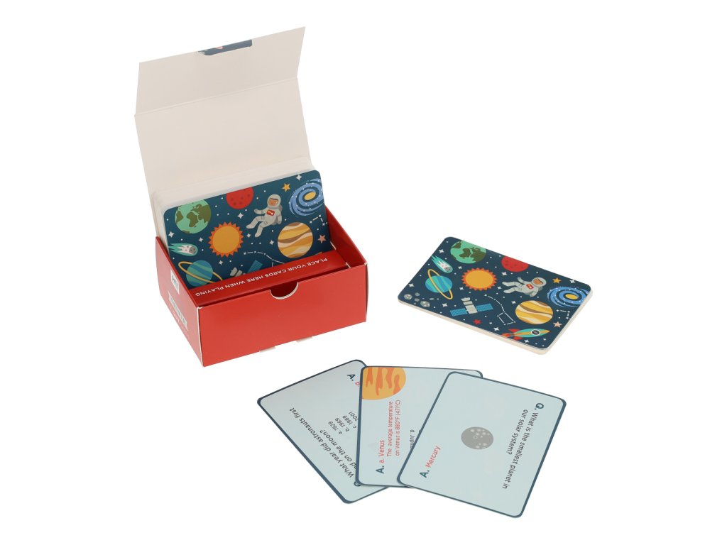 Kvízová hra pro všechny malé astronauty. Snadno s ní můžete dětem rozšířit obzory a pomáhat s učením. Každá z originálně ilustrovaných karet obsahuje otázku s odpovědí z oblasti astronomie a dobývání vesmíru, například: „Jaká je nejžhavější planeta v naší sluneční soustavě?“ Hra je v anglickém jazyce a je vhodnou pomůckou k procvičování angličtiny. Skvělá zábava na cesty, pro večery trávené pod hvězdnou oblohou i deštivé dny trávené doma! Hlavní vlastnosti:50 karet s kvízovými otázkamivhodné k procvičování angličtinyvyrobeno ze 100% FSC® certifikovaného papírupotištěno rostlinnými inkousty Značka a certifikát FSC® (Forest Stewardship Council) zaručuje, že dřevo, ze kterého byl produkt vyroben, nebylo vytěženo nelegálně a pochází z lesů obhospodařovaných šetrným či přírodě blízkým způsobem, ve kterém jsou dodržovány přísné environmentální a sociální požadavky. Značka FSC® na výrobku znamená, že svým nákupem pomáháte chránit lesy a podporujete šetrné, odpovědné či přírodě blízké hospodaření, díky kterému jsou naše lesy stabilnější, zdravější, mají přirozenou druhovou skladbu a lépe odolávají negativním následkům klimatických změn.